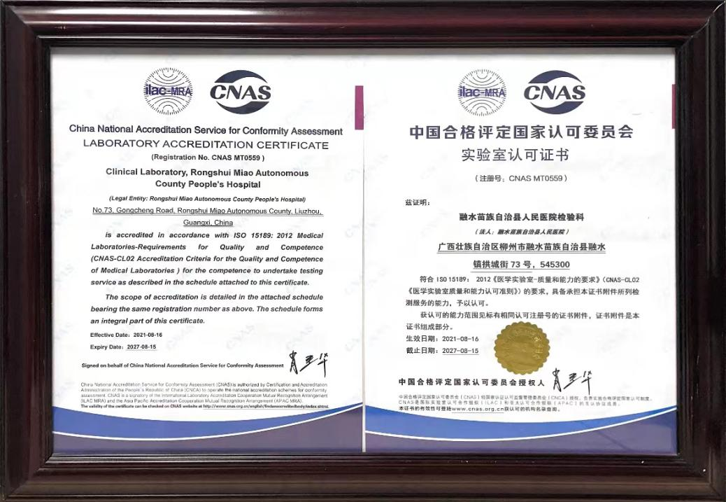 检验科是一个集医学检验、教学、科研为一体的综合性的临床实验室,一直以“提高检验质量,不断改善服务”为发展目标,积极进取。2015年获融水苗族自治县临床检验质控中心挂靠单位,2021年成为广西首家县级医院通过ISO15189医学实验室认可的医学实验室,2023年获柳州市重点专科(培育)科室。检验科是由30人组成的检验团队,其中高级职称9人,中级职称12人,检验医生1人,本科学历28人,学科队伍人员素质高,梯队建设合理。